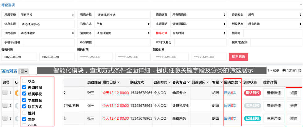 查詢組合條件豐富,界面展現可自定義;針對競價需要看關鍵詞,來源渠道;針對咨詢需要看電話號碼,預約時間;針對網咨、面咨需要看預約備注;可自定義展現。